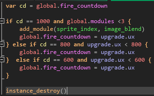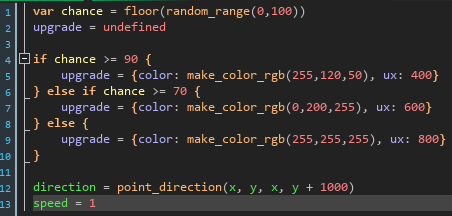 We create a chance variable, which is responsible for the rarity of the boost level. After the filtering conditions, we assign the upgrade variable the values color and ux. UX is the variable responsible for what the upgraded variable will be, in this case global.fire_countdown.